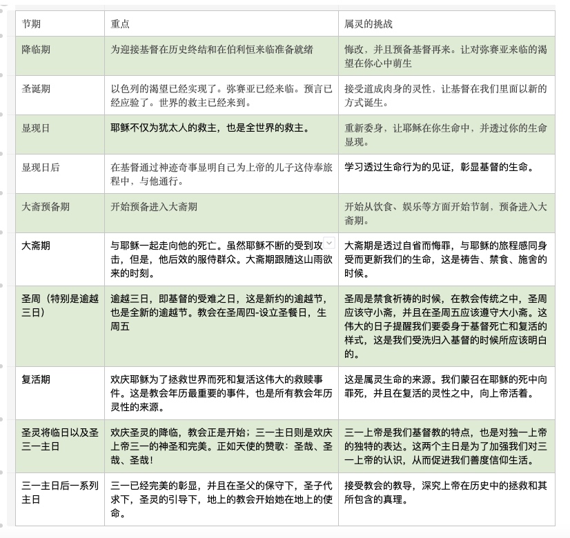 第三、各种关于基督生平的节期,比如圣诞、显现、受难、复活、升天等等。这些引领我们进入基督的奥迹之中,让我们在一整年之中,经历基督的奥秘,经历基督在世时序,让我们与主同走此路,让我们亲身经历上帝的救恩。
